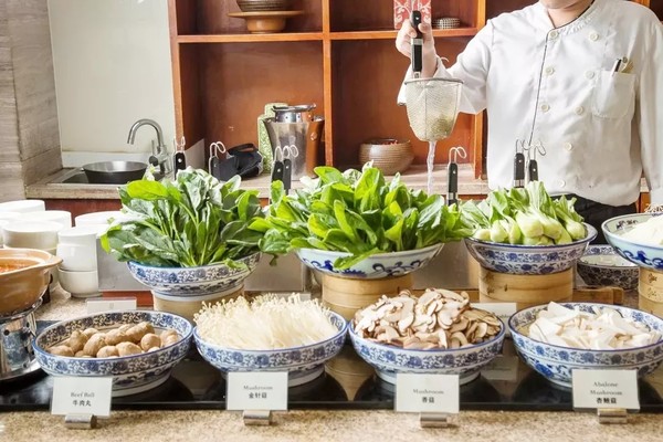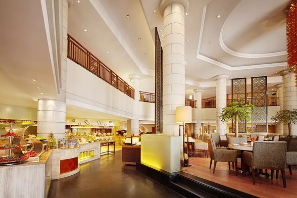 吴宫萃英园西餐厅全天候提供零点佳肴以及西式和亚洲自助餐等丰盛美食,自助早餐和晚餐都在这里享用,品尝美食之余还能欣赏到庭院景致。