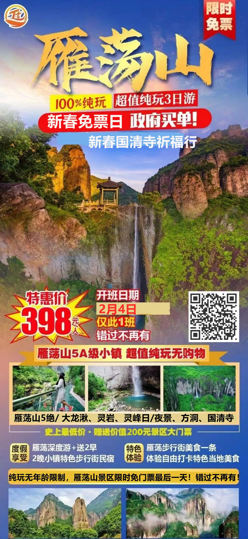 | 雁荡山三日游 免票雁荡山 祈福国清寺 100%纯玩超值纯玩3日游 新春免票日! 政府买单! | ||||
