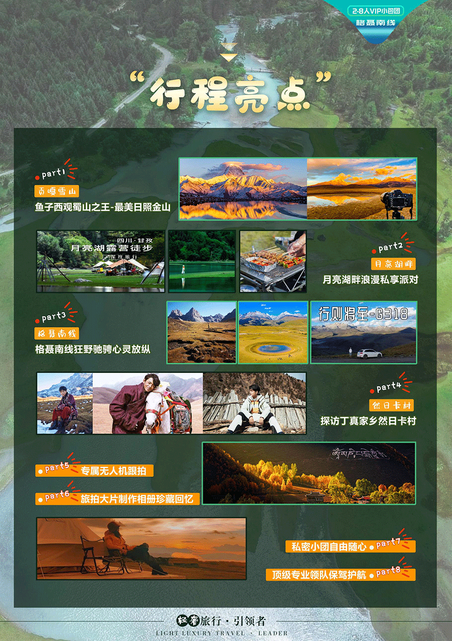 9、本产品行程中会安排轻奢野营体验(非露营过夜),露营地点会由领队根据经验随机挑选,并非收费营地,周边无配套服务,露营装备均由我社提供,只为更贴近自然,享受野趣。露营时装备搬运、天幕搭建需全体团员共同完成,领队负责协助游客,并指导搭建。如不想参与装备帮运及营地搭建的游客,则视为放弃野营体验,需在旁等待其他游客。